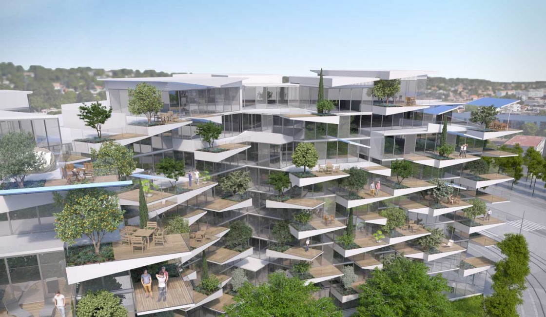 Balcons en forme d’aile. Après un concours lancé par la Ville fin 2014, l’agence Valode & Pistre, associée à l’atelier Antoine Garcia-Diaz et à l’agence Tourre Sanchis Architectes, a dessiné un ensemble de cinq bâtiments en demi-cercle pour héberger ce programme mixte de 28 000 m2 SP. A la proue, le logement en locatif aidé (Nouvelle Ere) sera accolé à une résidence étudiante (L’Envolée), des commerces et une école (1 000 m2).