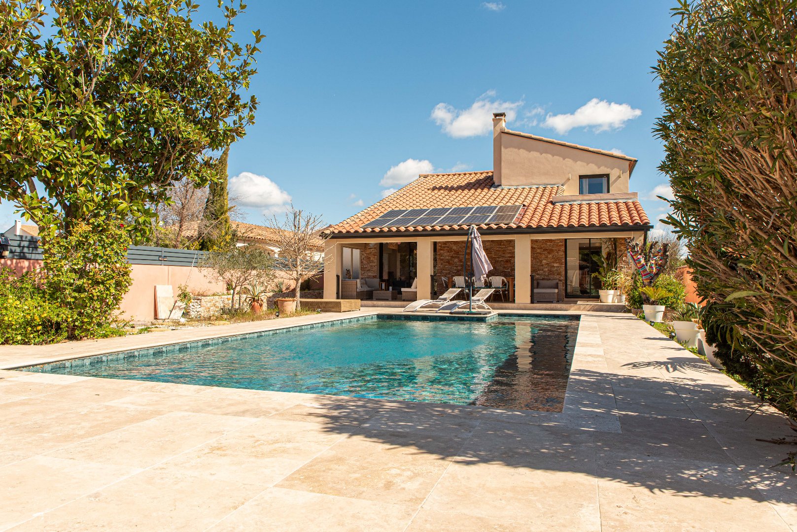 Située dans un village prisé à quelques minutes à l’ouest de Montpellier, au calme d’un quartier résidentiel, cette belle maison offre un cadre de vie élégant et serein. Récemment rénovée avec un soin particulier, elle conjugue raffinement contemporain et matériaux haut de gamme. Les volumes ont été repensés par un architecte afin d’optimiser et valoriser chaque espace. D’une surface d’environ 200 m², au Rez de chaussée, la maison s’articule autour d’un vaste séjour cathédrale, à la fois convivial et chaleureux, ouvert sur le jardin. Il est complété par une suite. L’étage propose trois chambres confortables et lumineuses ainsi qu’un solarium. Un espace supplémentaire vient compléter l’ensemble : idéal pour un atelier d’artiste, une salle de sport ou une suite indépendante selon les envies. À l’extérieur, le jardin paysager, sans vis-à-vis, invite à la détente avec sa piscine au sel, sa terrasse ombragée et ses espaces végétalisés soigneusement agencés. Une maison clé en main, à la fois intime, élégante et prête à accueillir une vie familiale, à quelques pas seulement de Montpellier.