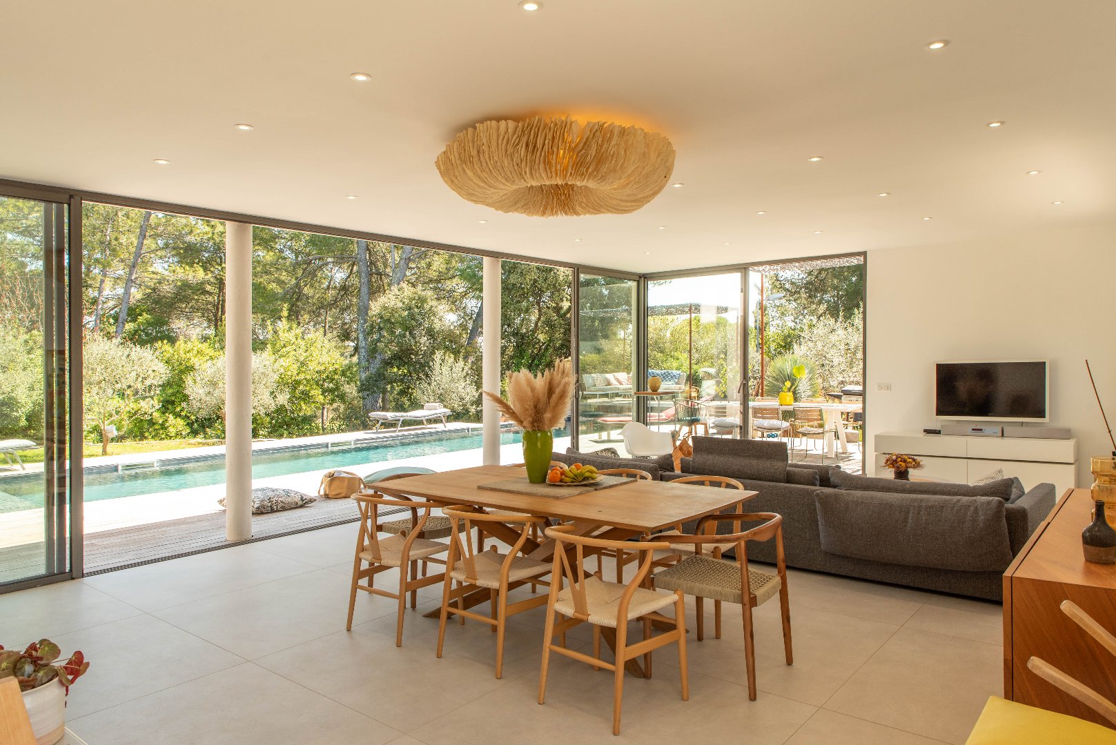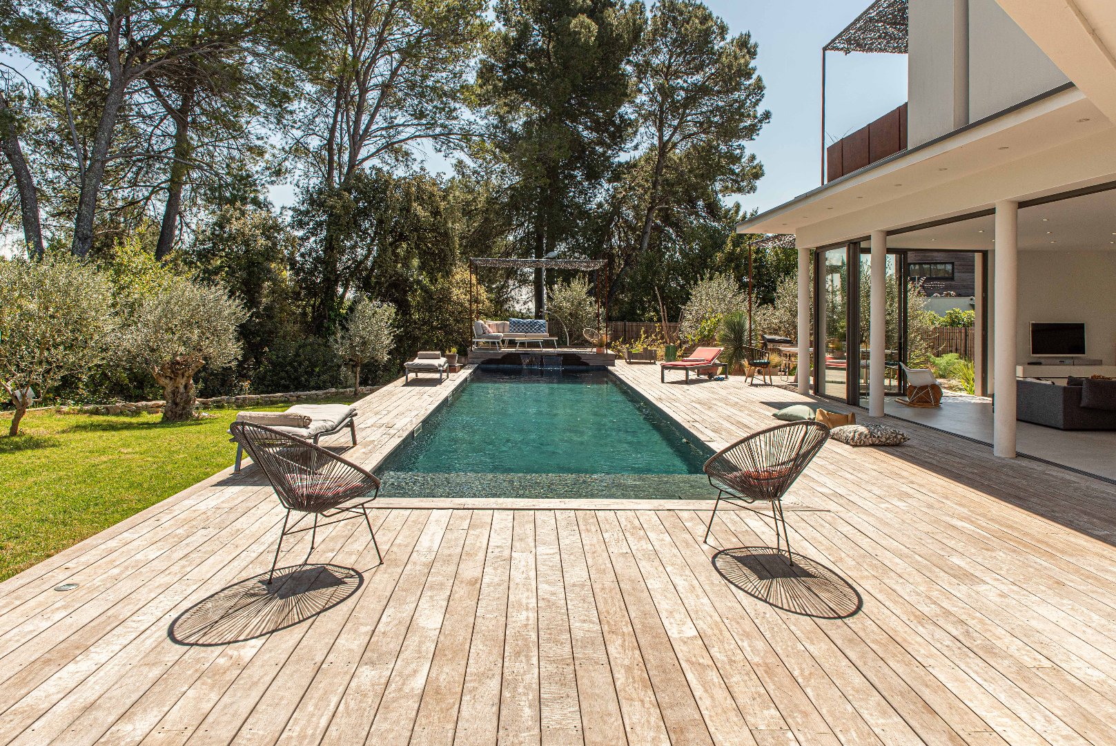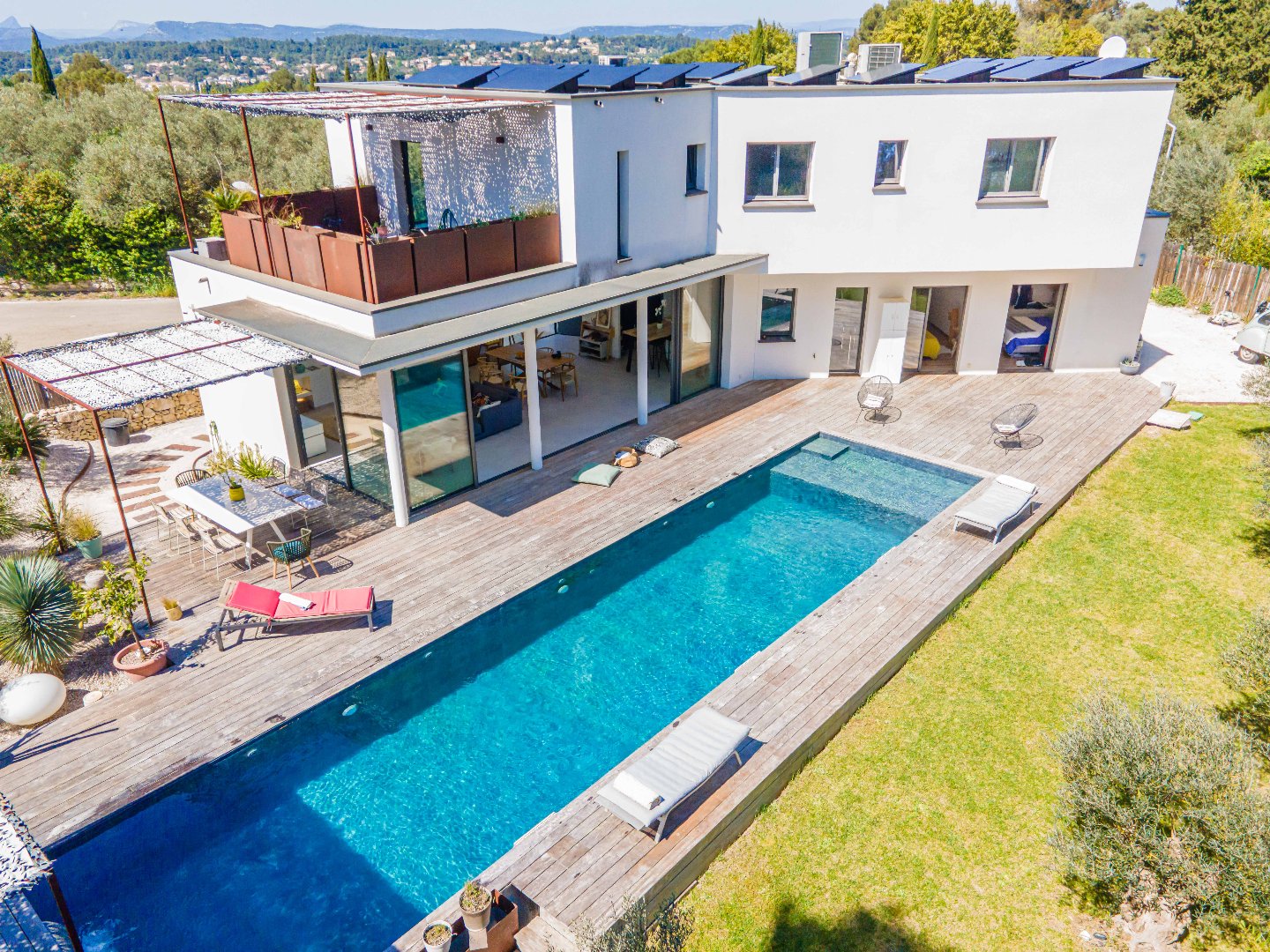 A 30 minutes de Montpellier et de Nîmes, dans un écrin de verdure résidentiel, à quelques minutes simplement du centre de la commune, cette superbe villa contemporaine d’environ 210 m² habitables a été réalisée sur mesure pour offrir à ses hôtes tout le confort souhaité ! Dès l’entrée dans la villa, un vaste séjour d’envion 70 m² s’ouvre sur une large terrasse et une piscine de 15 mètres de long. La perspective est superbe sur de grands arbres, les lignes sont épurées, la transparence des lieux est renforcée par de larges baies vitrées. La villa a été réalisée avec des matériaux haut de gamme: carrelage contemporain 120/120, climatisation réversible intégrée, cuisine design … Côté nuit, 2 belles chambres avec leur point d’eau au niveau du rez de chaussée. A l’étage, une magnifique suite parentale avec dressing et salle de bain privative s’ouvre sur une belle terrasse dui domine l’environnement. Trois suites junior supplémentaires complètent la partie nuit. La villa est équipée de panneaux solaires pour une gestion autonome de son énergie. Une très belle opportunité de vie en résidence principale ou secondaire !