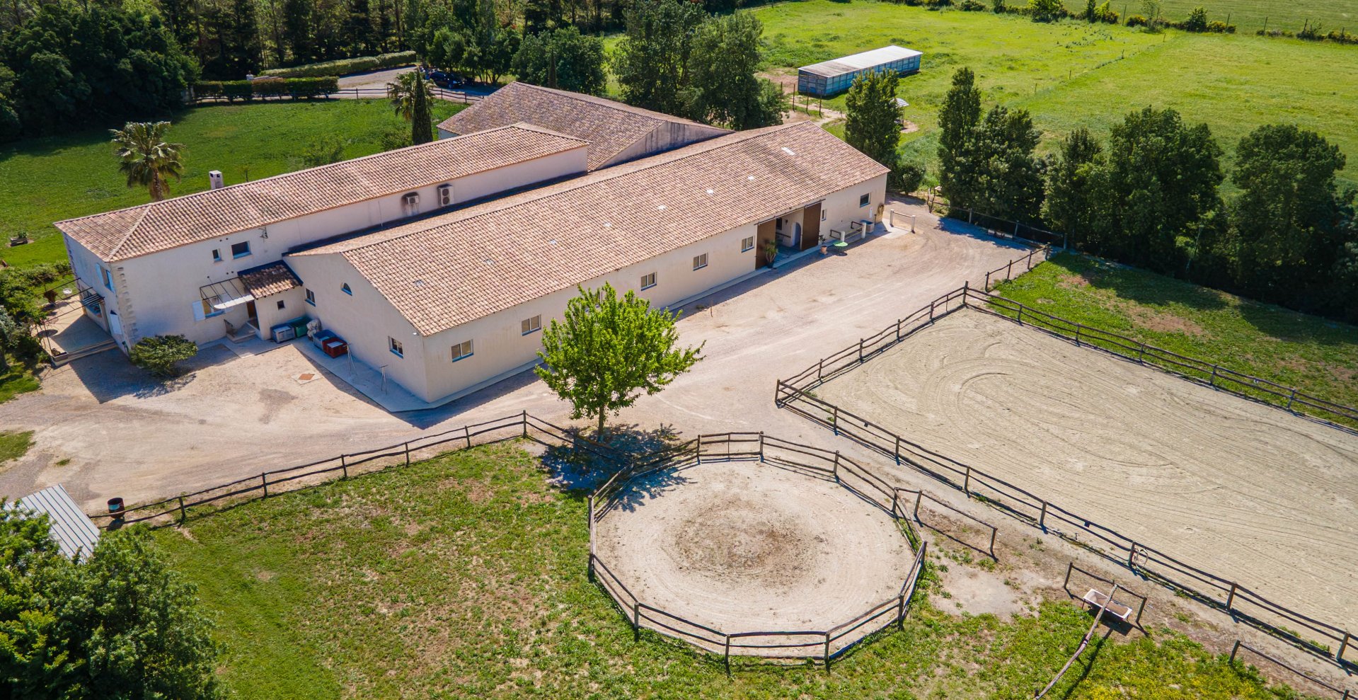 Propriétés équestre entre Nîmes et Montpellier, aux portes du littoral. Idéalement située au cur de la Petite Camargue, à proximité immédiate des plages de La Grande-Motte et des infrastructures des métropoles de Montpellier et Nîmes, cette élégante propriété équestre offre un cadre de vie rare, entre nature préservée et dynamisme urbain. Édifiée en 2002 dans le plus pur style des mas camarguais, la demeure principale développe environ 300 m² de surface utile. Sur deux niveaux, elle propose des volumes généreux et lumineux, sublimés par des matériaux nobles et une belle hauteur sous plafond. On y découvre un vaste salon cathédrale avec charpente apparente, une cuisine fonctionnelle et conviviale, quatre chambres, dont une suite parentale en rez-de-chaussée, deux salles de bains, un bureau, une mezzanine en coursive, une salle de sport, un cellier, une chaufferie et un grenier à aménager. À l’extérieur, la maison s’ouvre sur une piscine et un plan d’eau, dans un environnement paysager et sans nuisance. Installations équestres professionnelles. Réparties dans deux bâtiments attenants, les installations destinées aux activités équestres sont particulièrement bien pensées et parfaitement entretenues. Elles comprennent un manège couvert 15×30 m, une carrière de dressage 20×60 m, un rond de longe, cinq paddocks, une écurie de 14 boxes, une aire de pansage avec douches, une sellerie, une paillère, un club-house avec bureau, un appartement indépendant pour cavalier ou personnel, un garage-atelier. Le tout s’étend sur 1,35 hectare de terrain entièrement clos et sécurisé. Des opportunités d’agrandissement. La propriété peut être complétée par deux lots de terres agricoles attenants, disponibles à l’acquisition, un premier lot de 2,5 ha avec deux abris pour chevaux, un second lot de 5 ha, idéal pour cultures ou pâturages. Une propriété rare, alliant élégance et fonctionnalité. Cette propriété est une opportunité exceptionnelle pour les passionnés d’équitation souhaitant allier projet familial et activité équestre, ou pour des professionnels du monde du cheval à la recherche d’un site immédiatement opérationnel dans un cadre privilégié. Votre contact pour ce bien : Alain Auguste 07.69.15.28.67 Agent Commercial n° 392 128 146 CCI HERAULT DEFLANDRE Résidences et Propriétés. Honoraires à la charge du vendeur. Classe énergie B, Classe climat A. Montant estimé des dépenses annuelles d’énergie pour un usage standard : entre 1250 euros et 1750 euros. Les informations sur les risques auxquels ce bien est exposé sont disponibles sur le site Géorisques : georisques.gouv.fr