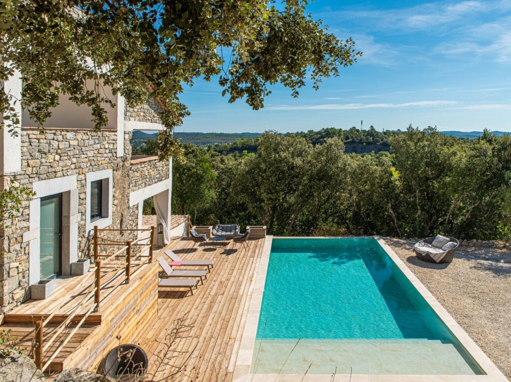 Au pied des Cévennes, à 40 minutes de Montpellier et de Nîmes, sur un magnifique site naturel de 2 hectares, ce superbe mas d’environ 385 m² habitables a été totalement rénové avec de très jolis matériaux, imprimant ainsi un style unique entre décoration et aménagements contemporains et le caractère de la pierre. L’ensemble immobilier est organisé autour de plusieurs pièces de vie commandées les unes aux autres, elles offrent des panoramas variés sur une nature exceptionnelle. Les points de vue sur la vallée, les contreforts des Cévennes, la garrigue et les forêts apportent une sensation d’espace et de perspectives infinies. Les terrasses en solarium ou au bord de la piscine vous permettront de profiter pleinement des lieux. La propriété dispose de 5 très belles suites complètes qui disposent toutes d’accès indépendants facilitant ainsi l’usage des lieux aux hôtes et amis. Les espaces extérieurs sont parfaitement aménagés pour un stationnement pour plusieurs véhicules à proximité de la maison. L’accès est sécurisé et l’aménagement d’un corral sur la partie plane de la propriété autorise la possibilité d’avoir des chevaux.